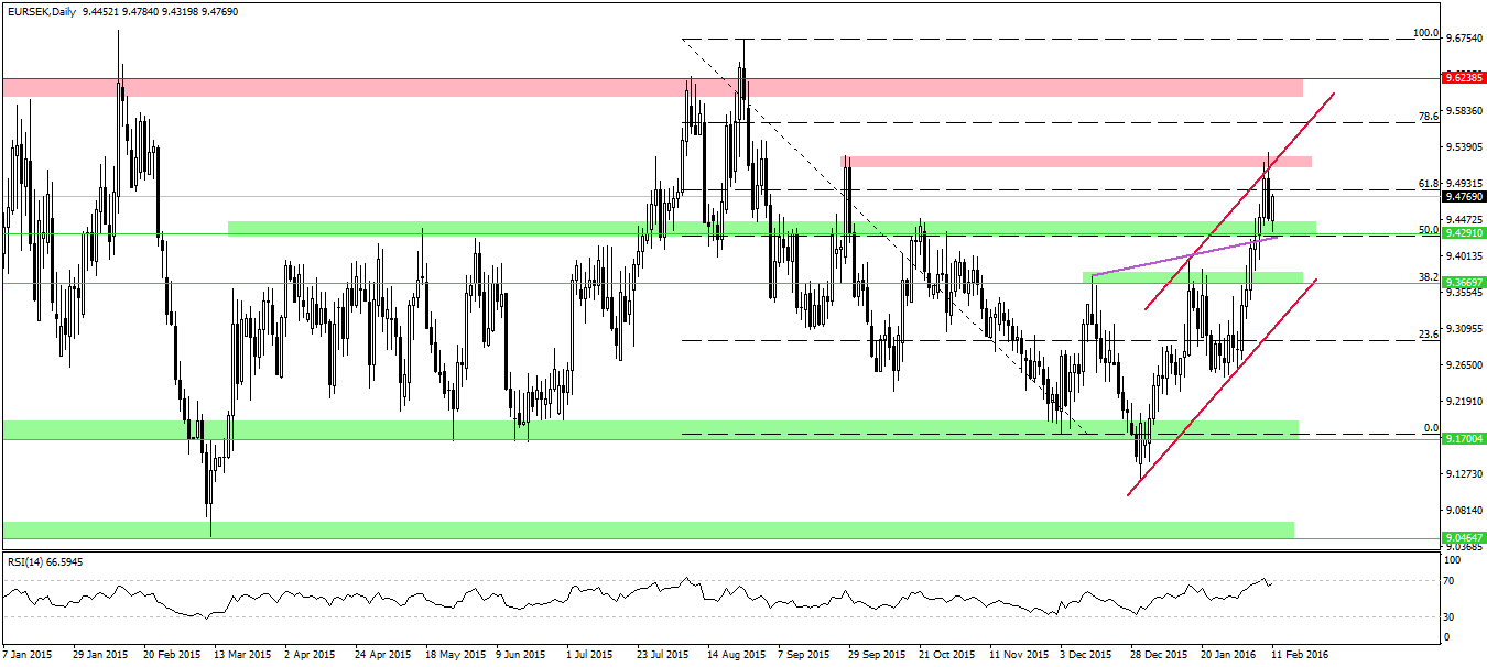 Rynek dolara do jena dotarł do rejonu, o jakim wspominają największe banki jako miejscu zawierania pozycji długich. Mowa o strefie wsparcia na 122,4. Wspierana jest ona poprzez zniesienie 50% (niebieskie poziomy). Jak widać rynek idealnie po osiągnięciu ostatniego minimum w tym miejscu zawrócił.
