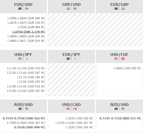Największe opcje dzisiaj na głównej parze walutowej (wsparcie w przypadku korekty) oraz na walutach z Antypodów. Należy dodać, że przedstawione niżej opcje są typu waniliowego, zatem pozostają „przy życiu” nawet po przekroczeniu strike’u opcji.