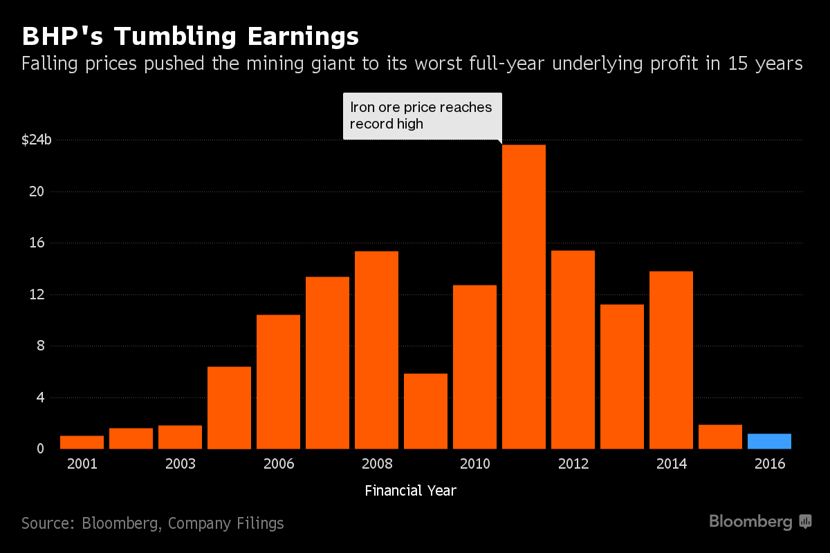 BHP Billiton, największa na świecie firma z sektora górniczego podała, że roczny zysk z zasadniczej działalności (pomniejszony o odpisy) spadł aż o 81%, do najgorszego rezultatu niewidzianego od 2001 roku po tym, jak ceny surowców tąpnęły w styczniu do 25-letnich minimów.